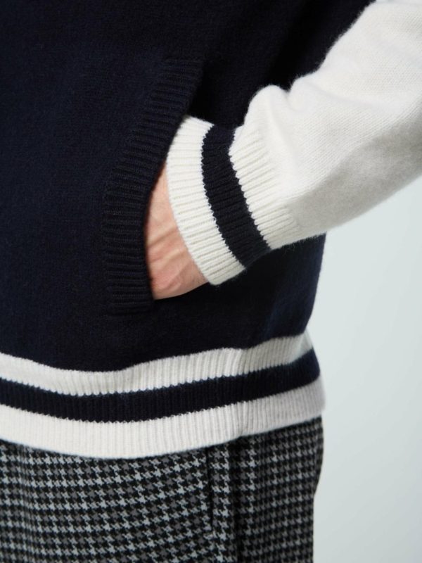 - Rib-knit shawl collar, cuffs, and hem with stripe detail
