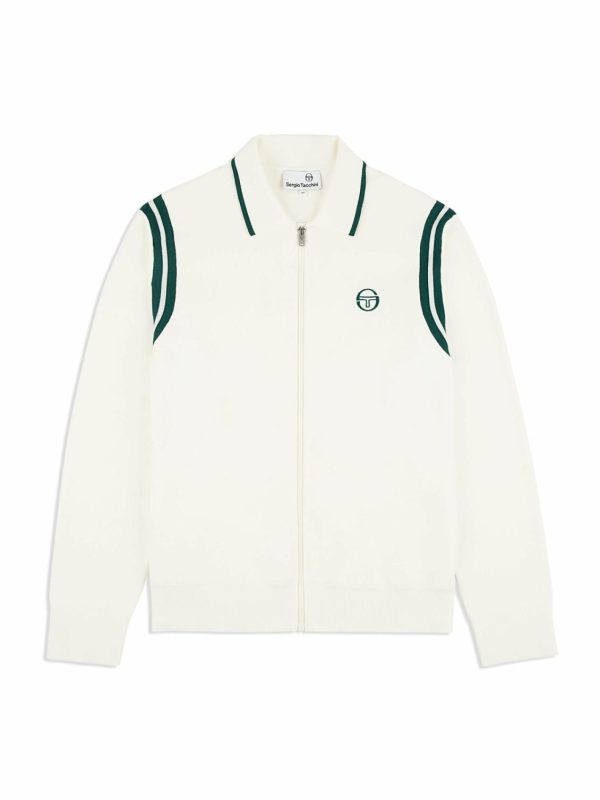 - Rib-knit fold-down spread collar w/ contrast tipping stripe