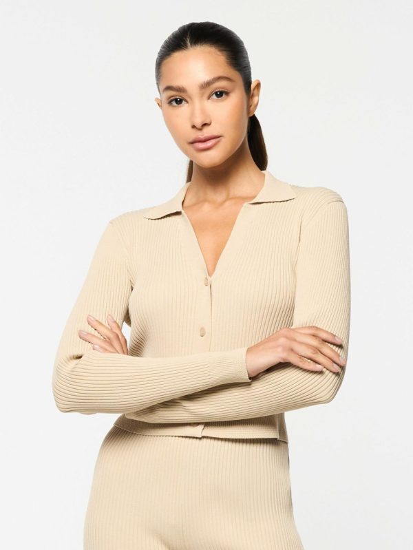 - 2×2 rib-knit at polo collar, cuffs, and hem