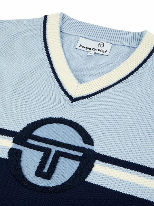 - 1×1 rib-knit w/ contrast stripe tipping at V-neck collar, cuffs, and hem